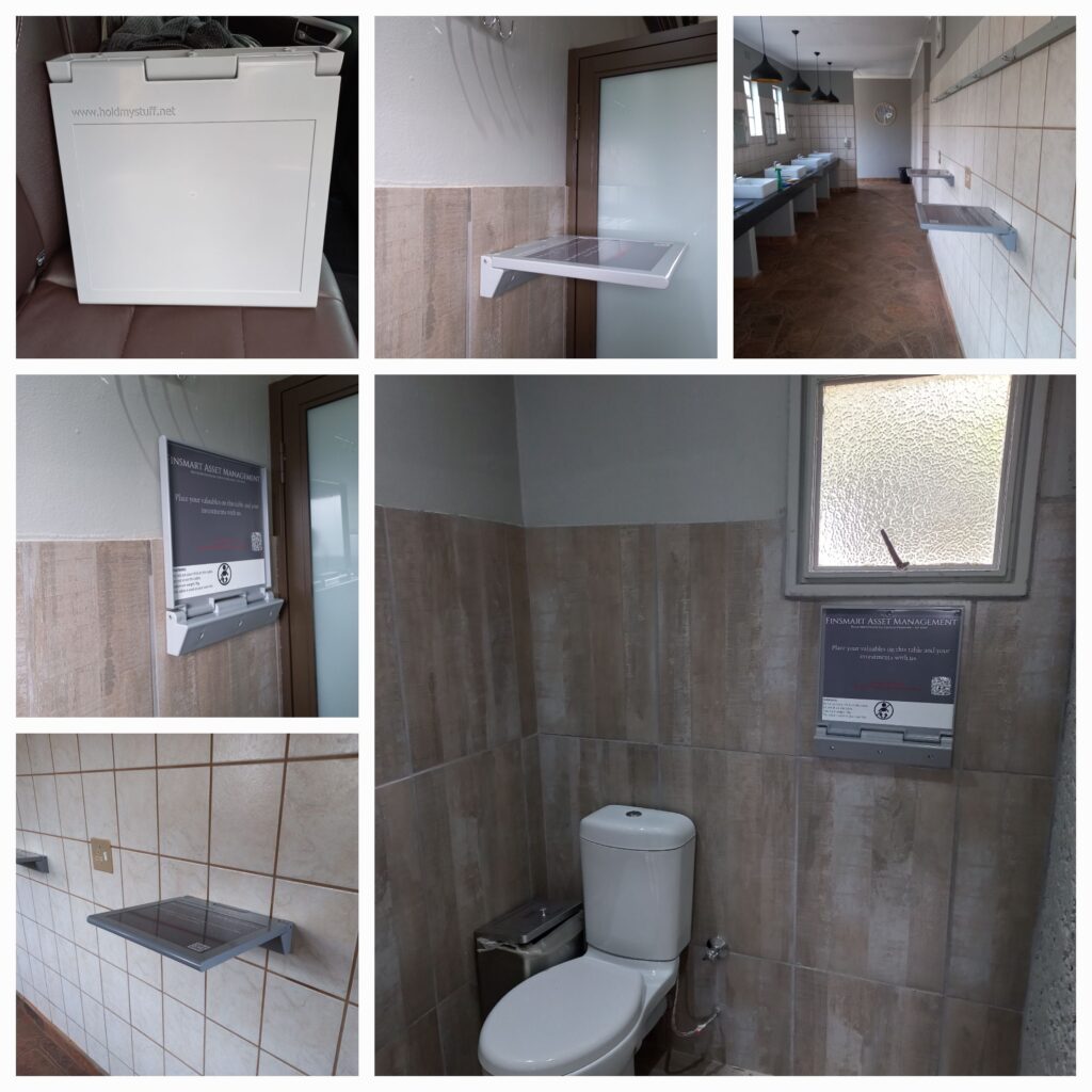 Without taking up any extra space in a cubicle Hold My Stuff offers an easy to use wall mounted fold-away table that provides a safe and clean space to place your valuables on and will also give the general public a more user friendly and hygienic experience when using a public toilet or cubicles.